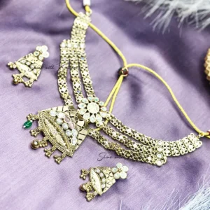 Inspired by the legendary beauty of Amrapali, this exquisite multi-layered choker set is a masterpiece of traditional craftsmanship. The necklace features three tiers of meticulously crafted golden chains that lead to a grand, temple-style central pendant.