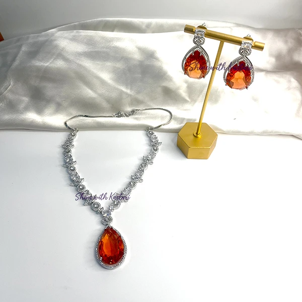 Grace your neckline with the refined beauty of the Celeste Pear Drop Necklace Set. Designed to captivate, this set showcases a delicate arrangement of pear-shaped American Diamonds that shimmer with every movement. The necklace is paired with matching earrings, creating a harmonious look that’s ideal for weddings, receptions, and special occasions.