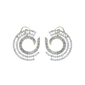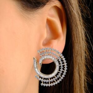 Premium Cubic Zirconia earrings in a distinct C shape. with beautiful setting of cubic zirconia (CZ). This item is available in two variants / colour – 2 tone (gold and silver) and silver only. The designer earring looks stunning on any ethnic or western dress.