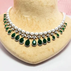 Shop Layered Necklaces, and this CZ Layered Necklace with Pearls & Green Stones is an elegant choker style adjustable Necklace. This Cuboc Zirconia Necklace is an impressive piece of jwellery with stunning combination of white pearls, blue colour stones and petal shaped rhinestones.