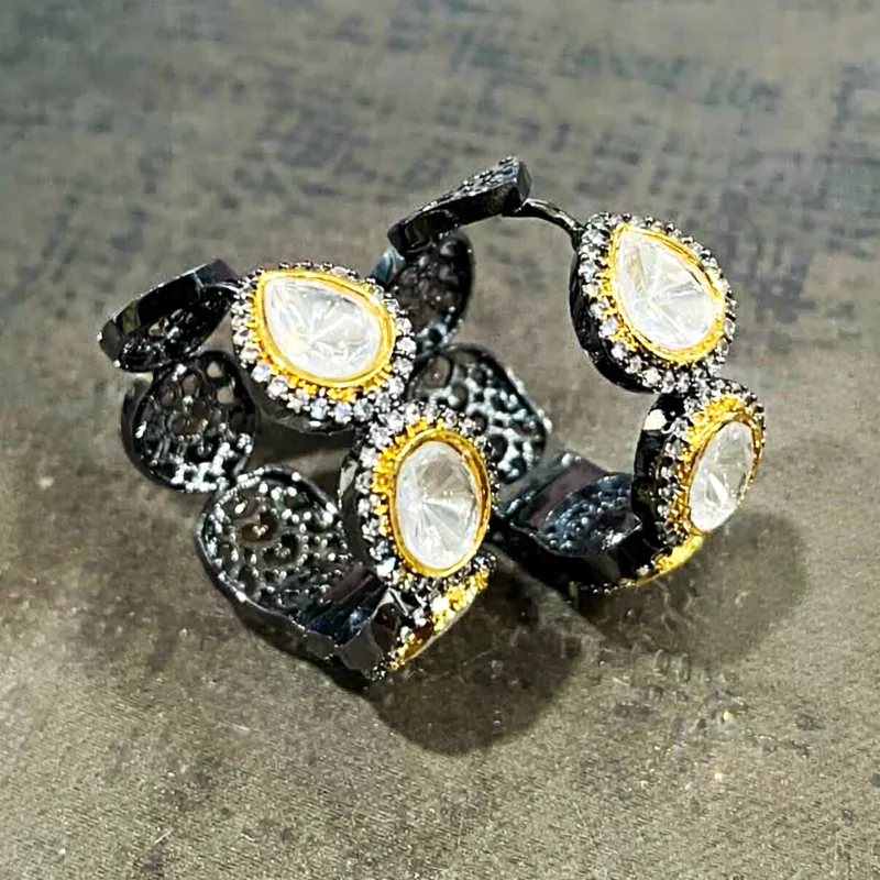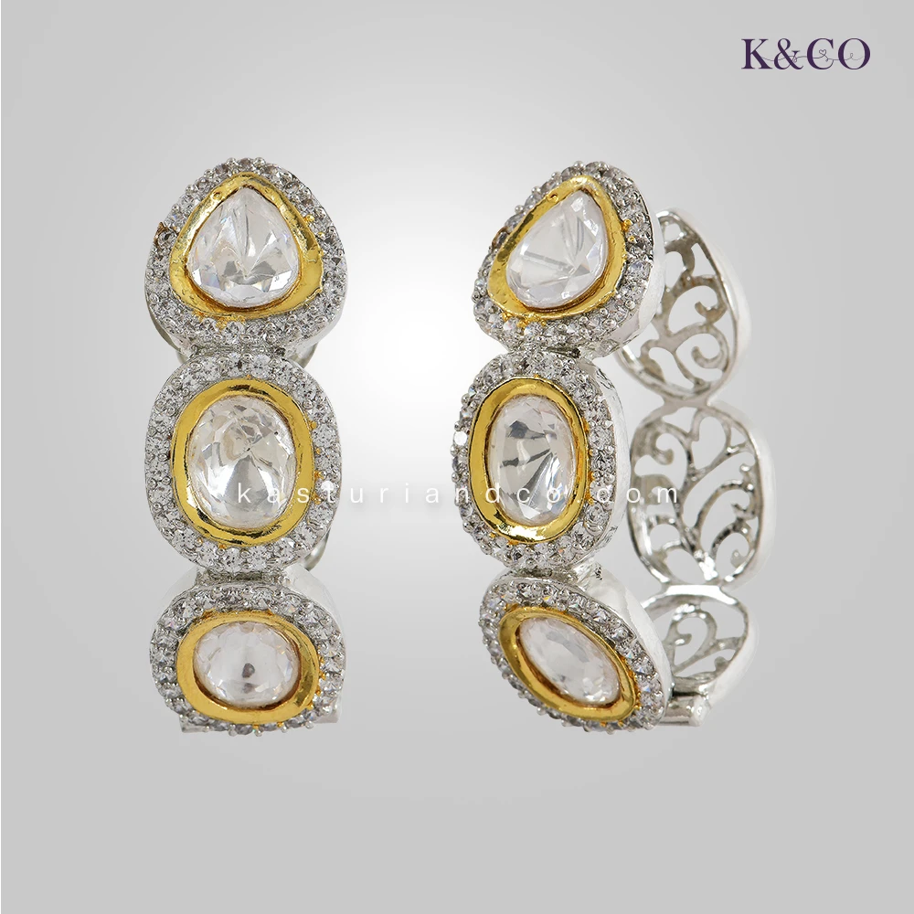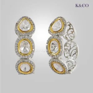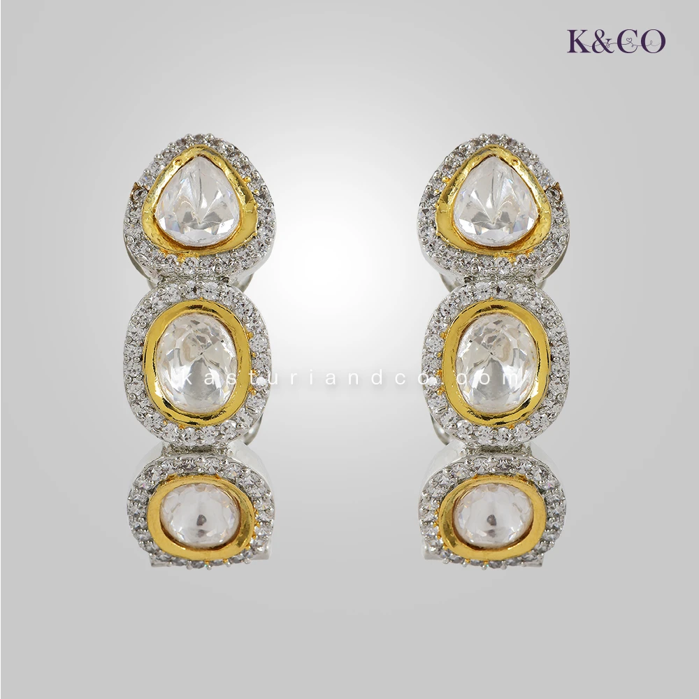 Stylish Polki Earrings in a very unique shape, premium CZ and silver plating adds to its beauty. These are very classy earrings, with a brilliant finish and an easy system to put in ears.