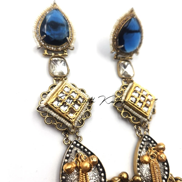 Long Kashmiri Jhumkis, with kundan & large stone at the top. The finish is antique and fusion of vaerous elements make this jhumki really unique and has a regal touch