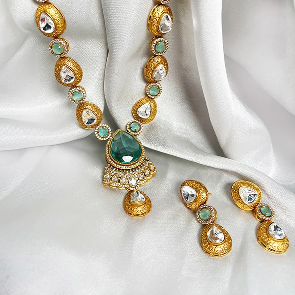 The Mira Royal Long Necklace Set showcases a perfect blend of tradition and elegance. Crafted with precision, this stunning jewelry piece enhances your festive and party look, making it ideal for weddings, celebrations, and special occasions.