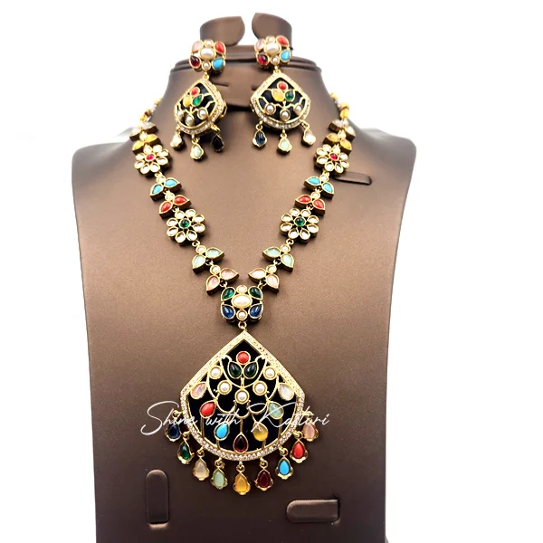 Multicolor Kundan necklace set is crafted with intricate detailing and adorned with vibrant red, green, blue, and golden stones. The bold pendant design is complemented with matching earrings, making it a complete set for festive occasions and weddings. Its floral and teardrop motifs add a regal charm, while the colorful stones ensure versatility with a wide range of traditional outfits.