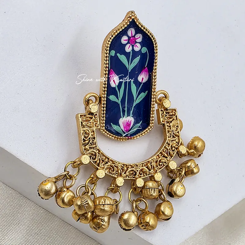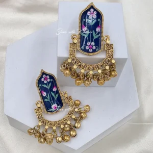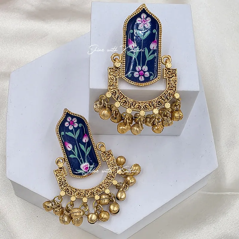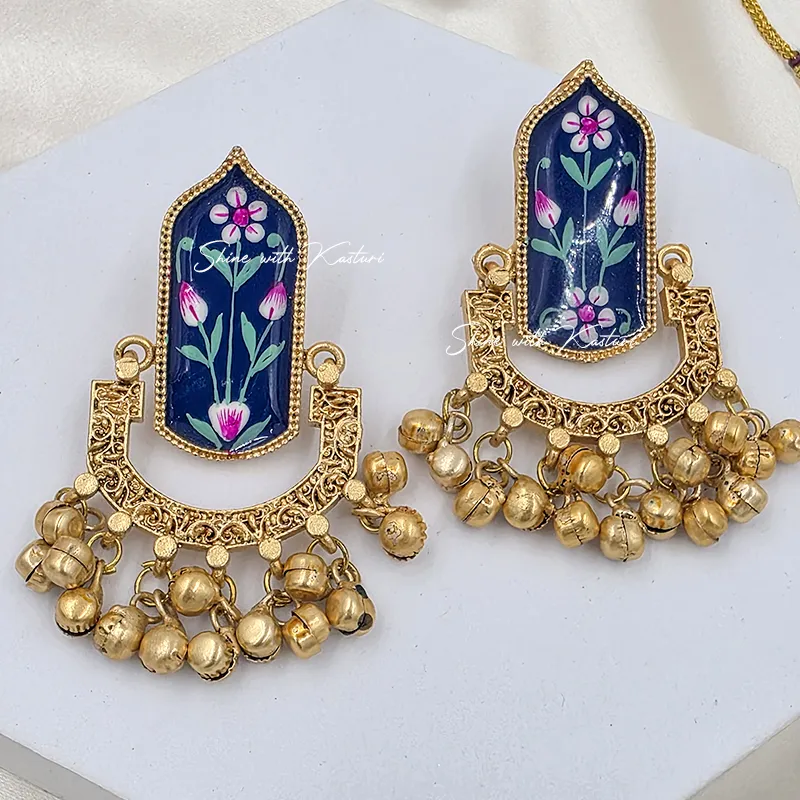 Neel Kamal Handpainted Jhumka showcase exquisite hand-painted floral artwork on rich blue enamel panels, framed with intricate antique gold detailing. Finished with classic ghungroo drops, these earrings create a graceful blend of artistry and tradition. Ideal for weddings, festive celebrations, and cultural occasions, they add timeless elegance to any ethnic ensemble.