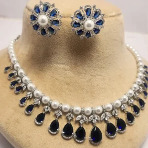 AD Layered Necklace is an elegant choker style adjustable AD Necklace with CZ, Pearls & Stones. This American Diamond Necklace is an impressive piece of jwellery with stunning combination of white pearls, blue colour stones and petal shaped rhinestones. The Pearls & Cubic Zirconia Layered Necklace has an extra ordinary design with brilliance to get you shining with your costume at any occasion.