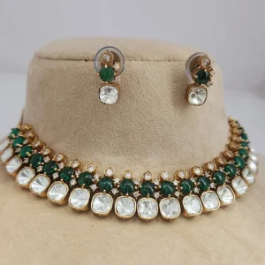 This is an elegant Polki Choker with layers of Stones & Mossainite, Green coloured stones add to its beauty. Make Heads Turn and wear this dazzling Mossainite and stone studded choker necklace set crafted with a combination of Mossainite and stones craftsmanship.