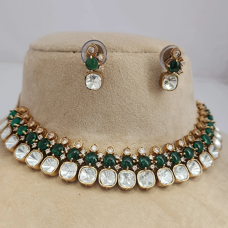 Polki Choker with layers of Stones & Mossainite, Green