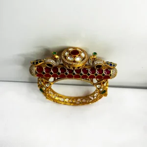 This ornate bangle features a prominent peacock motif, richly adorned with vibrant ruby-colored stones and shimmering polki accents. Its intricate design and radiant finish make it a perfect accessory for festive celebrations and traditional Indian attire.
