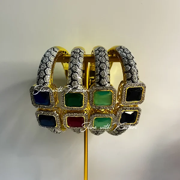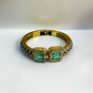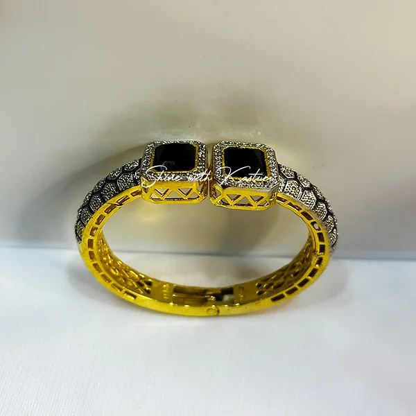 Regal Black Stone Antique Gold Kada is a statement piece that blends Traditional craftsmanship with a modern edge. Designed with an antique gold finish, it features twin square black stones at the center, bordered by intricate patterns of shimmering accents. The Kada’s sturdy yet elegant structure offers both comfort and luxury, making it ideal for festive celebrations, cultural events, or as a refined everyday accessory.