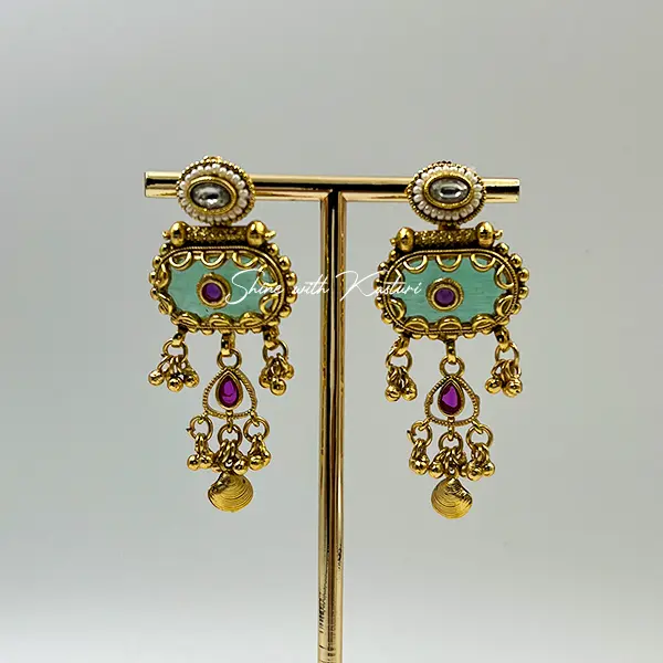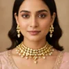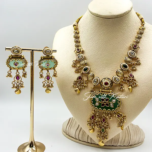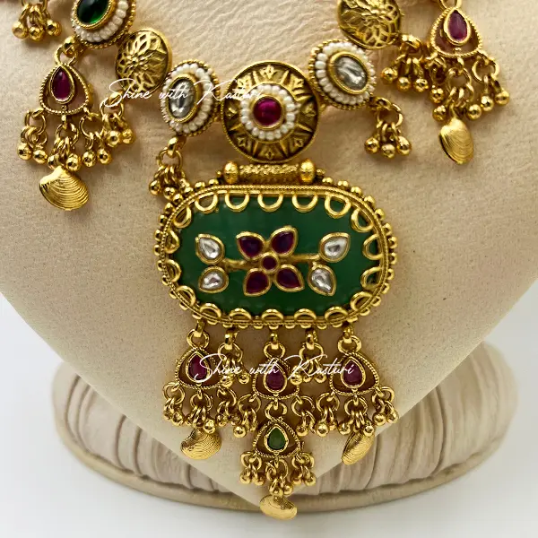 Make a majestic statement with the Empress Heritage Necklace, a stunning piece of traditional Indian jewelry that radiates regal charm. This handcrafted necklace features a double-layered gold bead chain adorned with vibrant red, green, and white stones. The centerpiece is a bold green oval pendant framed in gold and embellished with red and white accents, complemented by intricate gold tassels and decorative elements. Perfect for bridal wear, cultural ceremonies, and festive occasions, this necklace celebrates the richness of Indian artistry and timeless elegance.