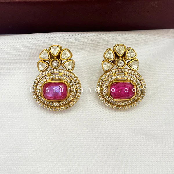 Gold-Plated Earrings with Royal Blue Stone in elegant design. they llok elegant with stunning oval-shaped blue stone at the center, surrounded by sparkling diamond embellishments in a dual-circle design, these earrings exude timeless charm. The upper floral motif with pear-shaped diamonds adds a touch of grace and sophistication.