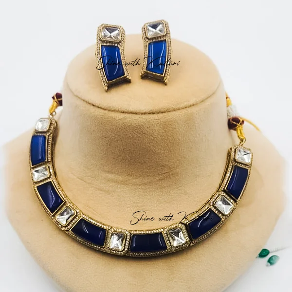 Royal Blue Stone and Kundan Gold Plated Choker Necklace Set, a perfect blend of regal charm and modern elegance. The necklace features alternating deep blue stones and sparkling Kundan accents set in a finely detailed gold-plated frame.