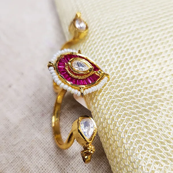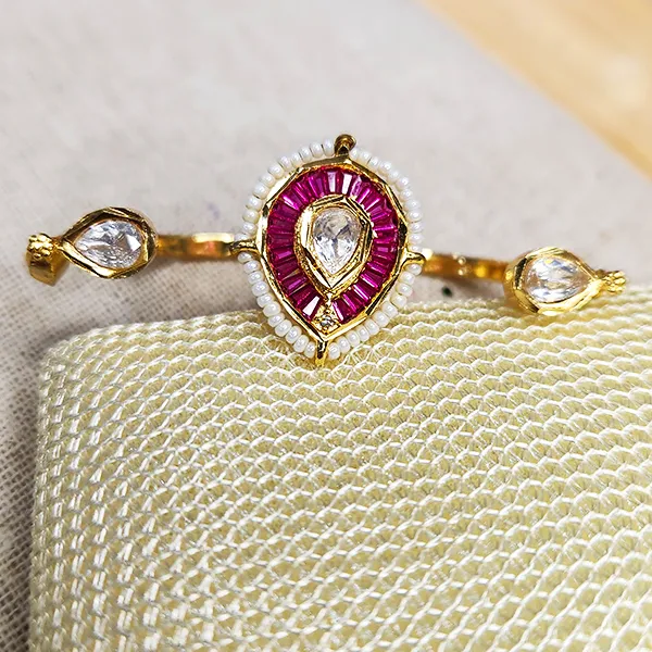 This adjustable ring features a prominent teardrop polki stone framed by rich ruby pink baguettes and a border of tiny pearls. Two smaller polki accents adorn the gold-tone band. It’s a captivating piece that beautifully blends traditional Indian design with a vivid color palette, perfect for adding a touch of allure to your hand.