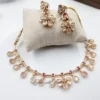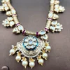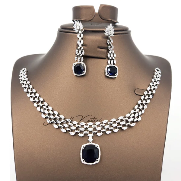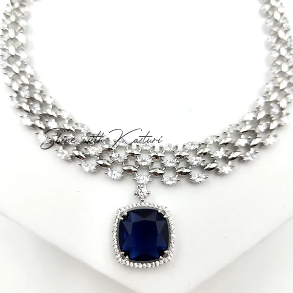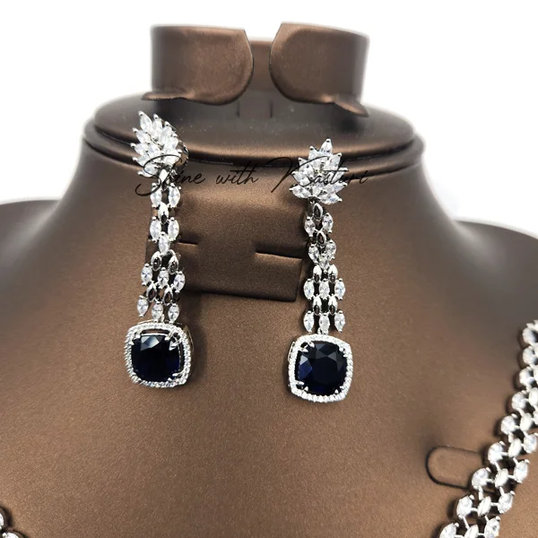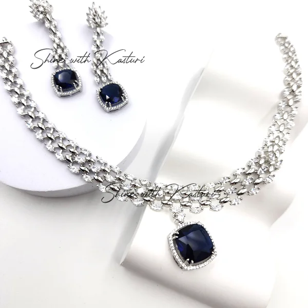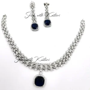 Selene CZ & Stone Necklace Set in Blue. Expertly designed with shimmering cubic zirconia and dazzling stones, this necklace set combines modern style with classic elegance. The striking blue accents enhance its charm, making it ideal for weddings, festive events, or evening parties. Pair it with traditional or western outfits to add a touch of sophistication and glamour.