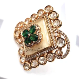 Royal Kundan polki ring in Square Enamelled Ring, a stunning masterpiece of traditional craftsmanship and modern elegance. The centerpiece features a radiant ruby floral design, set against a polished enamel square and bordered with shimmering white Kundan stones. The intricate detailing and luxurious gold-tone finish make this ring a true statement piece.