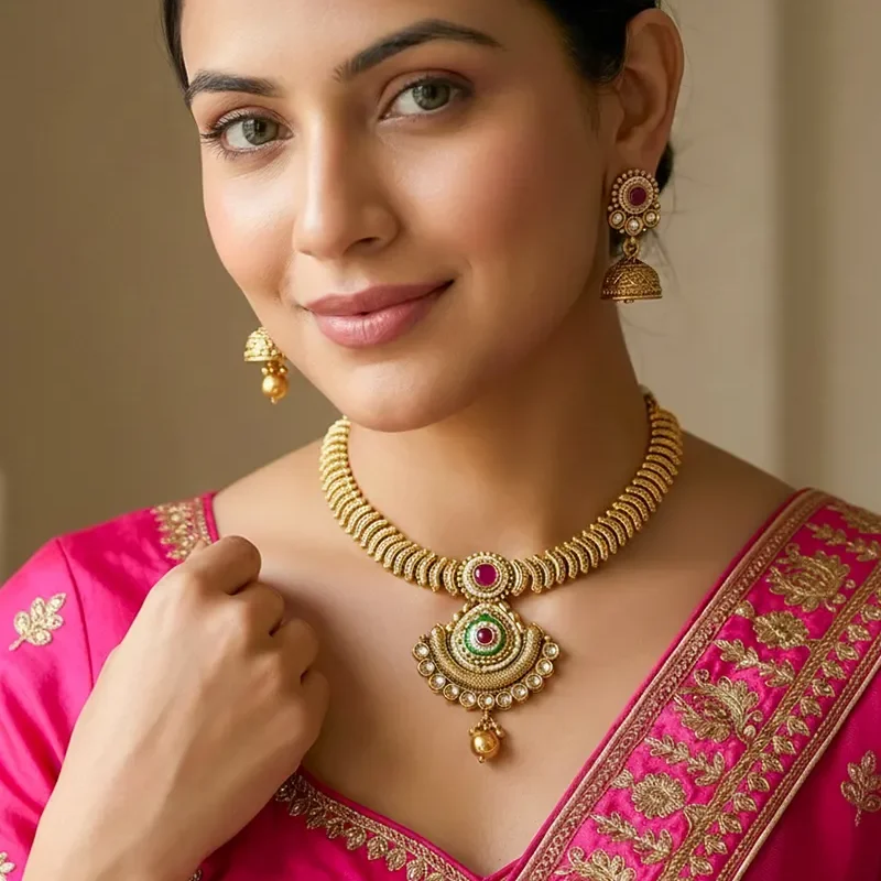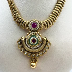 This kundan & Stone Necklace with Jhumkis feature a beautifully crafted stone and meenakari on pendant. The choker-style necklace is perfect for weddings, festivals, and special occasions. The matching jhumka earrings complete the regal look, making it an ideal choice for wedding and special events.