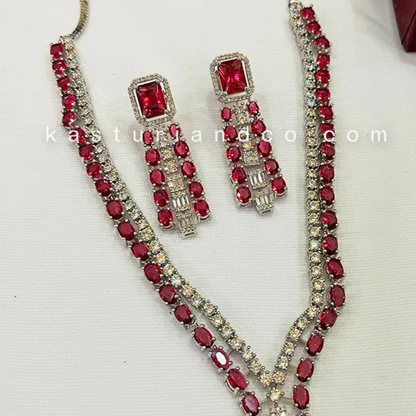 Trending Layered Necklace with CZ & Stones, ending with a doublet stone as pendant. This stylish dual layer necklace set looks stunning with cubic zirconia strand in silver plating and a second layer of stones in red color. Mini Stones alternating with a second layer of CZ spirals in layers for a stylish design. The tassel earrings are also multilayered with AD and stones in nice silver plating. This layered necklace set is very elegant and a show-stopper for any occassion.