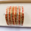 Pink Thread Work Crystal Bridal Bangles Set. Designed with delicate thread work and sparkling crystal embellishments, these bangles combine traditional artistry with modern elegance. The shimmering stones beautifully complement the rich pink base, making them ideal for bridal wear, festive celebrations, or party attire.