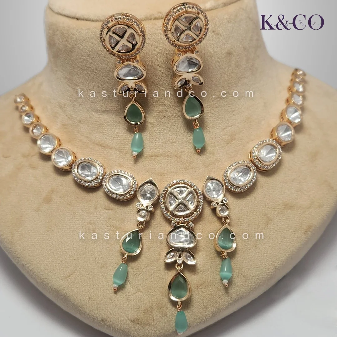 Delicate choker style necklace set with polki and light / sea green coloured stones in an elegant design.